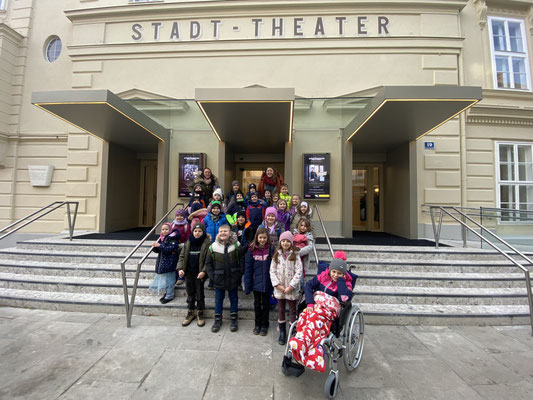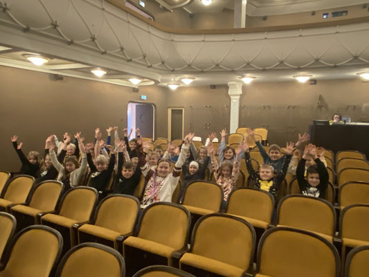 Danach besuchten beide Klassen eine Vorstellung des Musicals "Die fliegende Burg" im Kulturzentrum. Das Stück wird mit einer Liveband dargeboten und bringt auf unterhaltsame Weise Themen wie Anderssein, Selbstwert, Zusammenhalt und Teamgeist auf die Bühne. Der Text stammt von Thomas Brezina, die Musik von Gerhard Krammer, der sich sehr darüber freute, dass es den Kindern gefallen hat.