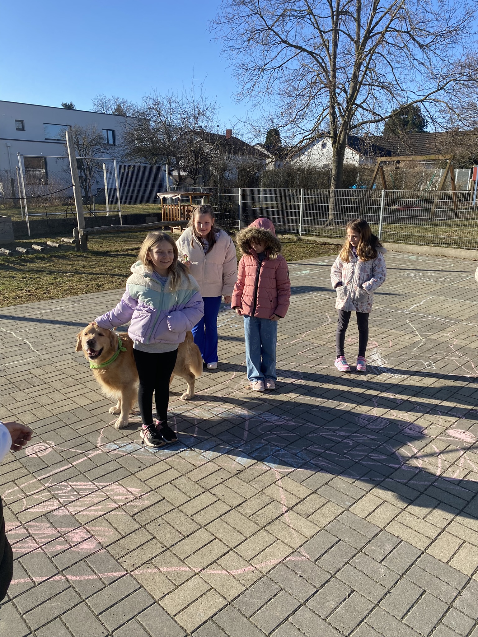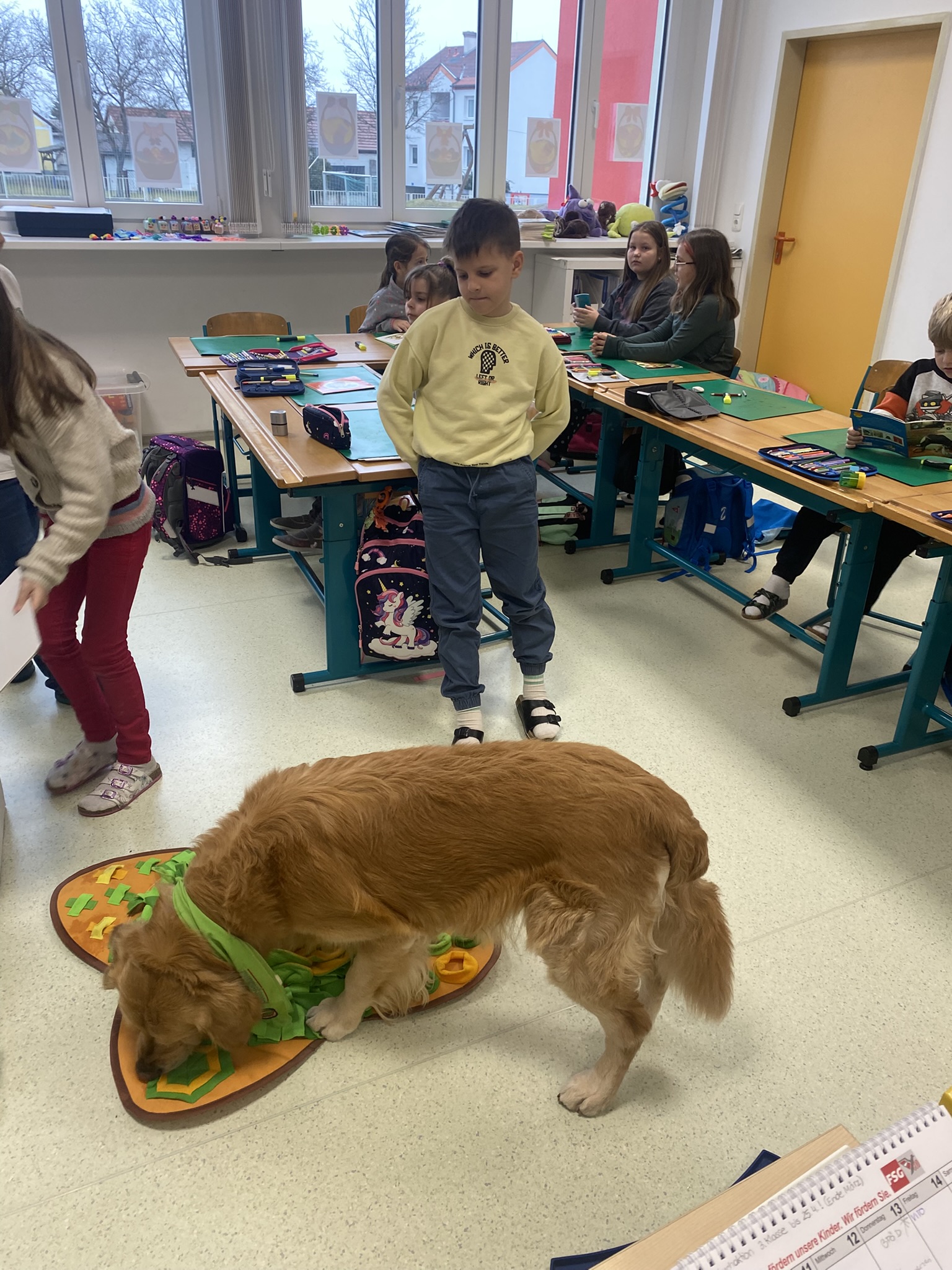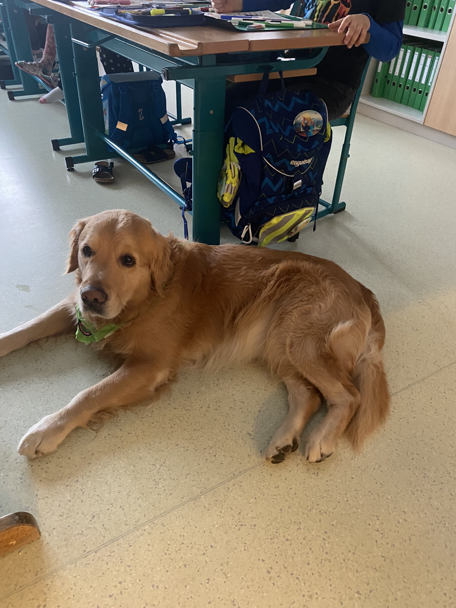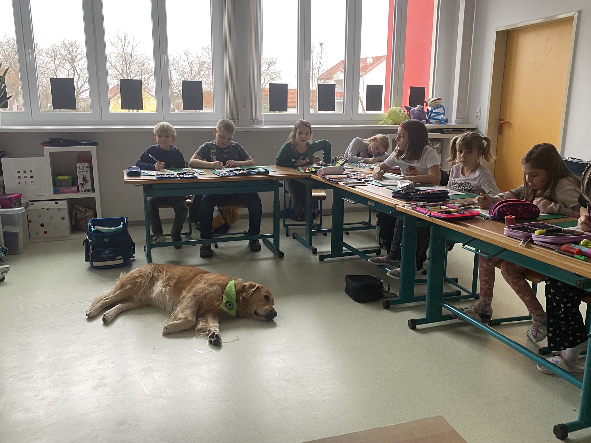 Seit diesem Schuljahr begleitet ein ganz besonderes neues Mitglied unsere Schulgemeinschaft: Schulhund Vito, ein freundlicher Golden Retriever, unterstützt gemeinsam mit seiner Besitzerin und Klassenlehrerin Christina Kolin einmal pro Woche den Unterricht in der 2. Klasse.